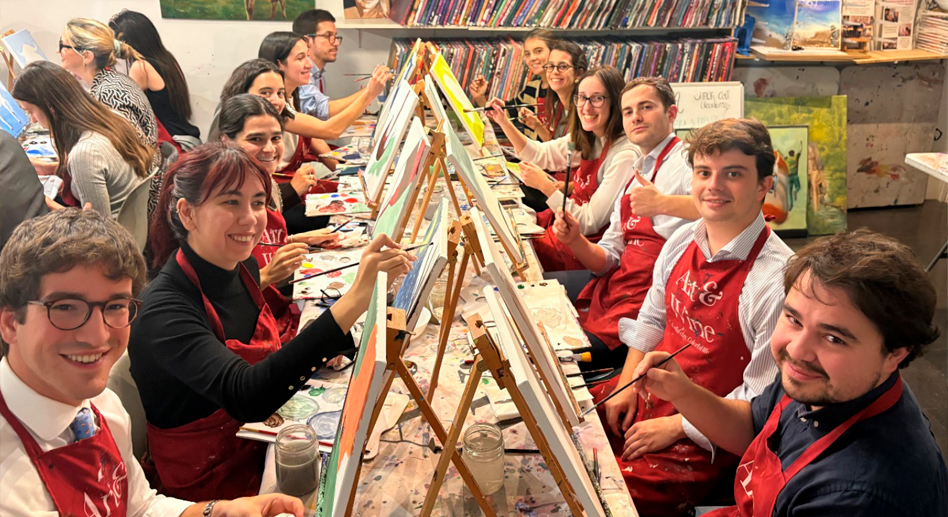 Durante la sesión, organizados en parejas, pusieron a prueba (y, en muchos casos, llevaron al límite) sus habilidades artísticas, acompañados de un pica-pica y vino. El resultado fue una colección de obras tan variadas como inesperadas. Al finalizar, cada pareja presentó su cuadro al resto del equipo y se celebró una votación para elegir la obra ganadora. Entre risas y alguna que otra sorpresa, se descubrió que el departamento sí cuenta con algún talento oculto… y con un gran espíritu de equipo.